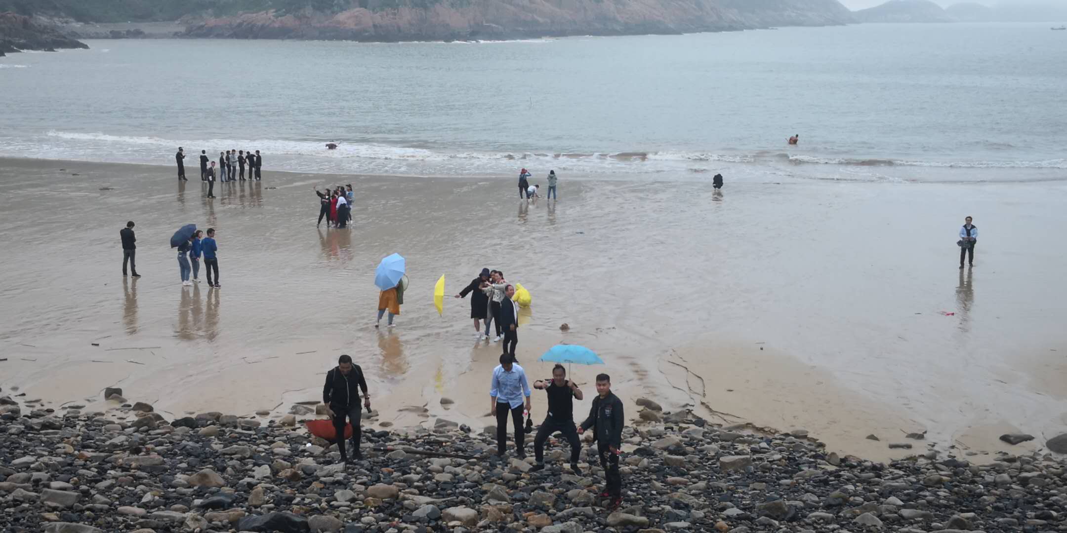 中轉站我們定在了大坑沙的沙灘上。這是一片幾乎被遺忘的原生態沙灘。沙灘的兩側是飽受海水侵蝕的礁石,形態各異。黑白相間的鵝軟石占據了這片沙灘。到時正趕上潮平似退未退時,在平坦結實的沙灘上走一走,迎面而來的潮水似進又退,不知不覺中也跟著他的步子,一步步走向大海,在潮水中嬉戲。不一會,天空下起了雨,似有留客的意思。